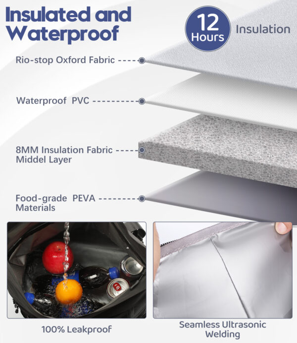 - Wärmedämmung: Die Außenseite der Kühltasche besteht aus 600D Oxford-Gewebe. Das Innenfutter besteht aus PEVA-Folie und Isoliermaterial, das Speisen und Getränke mehr als 5 Stunden lang kühl oder warm halten kann. Außerdem bietet der eingebaute 6mm EPE-Schaumstoff einen hervorragenden Schutz für Ihre Behälter, Lebensmittel und Getränke.