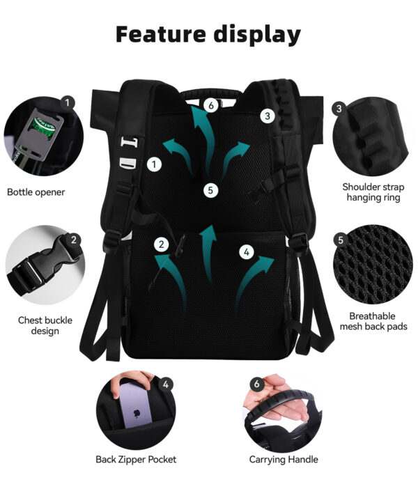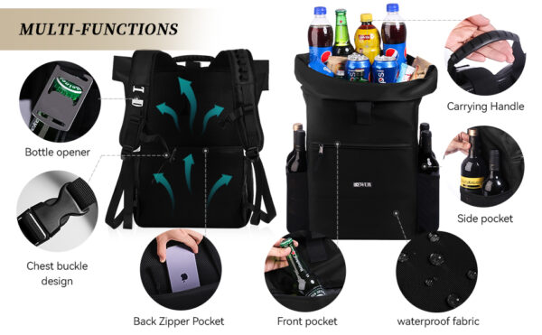 【Vielseitige Taschen】Im Inneren des Rucksacks befindet sich ein großes isoliertes Hauptkühlfach, zwei Seitennetztaschen, eine große Rückentasche und eine Vordertasche. Mehrere Taschen können Ihre Bedürfnisse zum Aufbewahren verschiedener Gegenstände erfüllen.