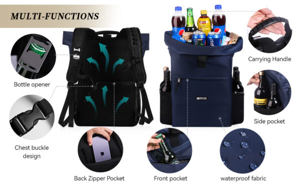 【Vielseitige Taschen】Im Inneren des Rucksacks befindet sich ein großes isoliertes Hauptkühlfach, zwei Seitennetztaschen, eine große Rückentasche und eine Vordertasche. Mehrere Taschen können Ihre Bedürfnisse zum Aufbewahren verschiedener Gegenstände erfüllen.