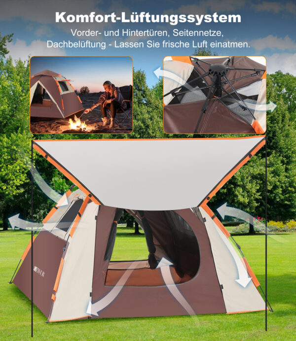 - 【Einzigartiges Design mit vorderen und hinteren Türen】Das einzigartige Design mit vorderen und hinteren Türen bietet zwei erweiterbare Vordächer an der Vorderseite und ein verdecktes Vordach an der Rückseite, was den Zeltbereich erheblich erweitert und die Fläche um 50% vergrößert. Große Belüftungsöffnungen vorne und hinten sorgen für eine ausgezeichnete Luftzirkulation im Zelt.