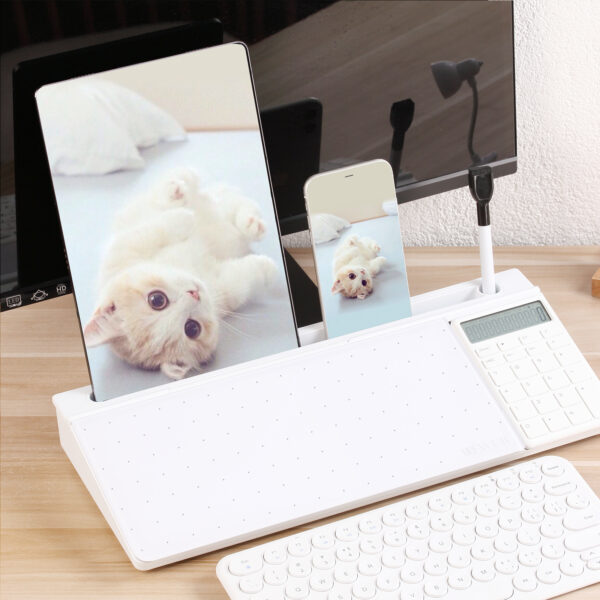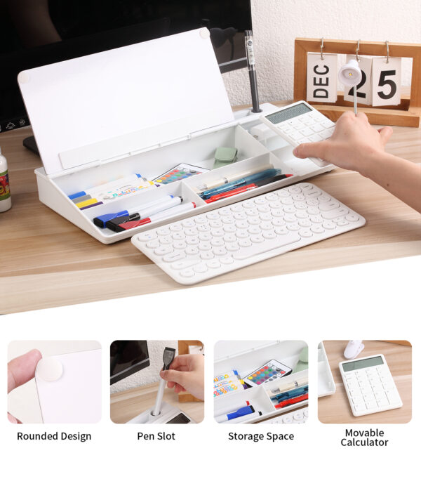 DEWUR Glas Whiteboard Desktop Memoboard, als Dock Handy Ständer, Tablet Ständer Tastatur Ständer Schreibtisch Organizer mit Zubehör für Büro, Zuhause, mit Taschenrechner