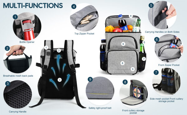 - 6 multifunktionale Taschen: Der Rucksack enthält ein kälteisoliertes Hauptfach, eine obere Aufbewahrungsschicht mit Reißverschluss, eine untere Vordertasche zum Aufbewahren von Besteck, eine geräumige obere Vordertasche, und 2 an der Seite eine Netztasche.Mehrere Taschen können Ihre Anforderungen zum Aufbewahren verschiedener Gegenstände erfüllen