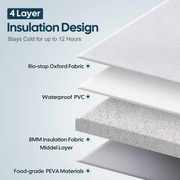 - 【Hält warm und hält bis zu 12 Stunden frisch】4 Schichten maßgefertigter Isolierschichten, die äußere Schicht besteht aus verschleißfestem Oxford-Stoff und einer wasserdichten PVC-Schicht, die Mitte besteht aus hochdichtem, verdicktem 8-mm-Schaum und der innere Eisbeutel nimmt an Heißgepresste PEVA-Schicht mit nahtloser Verbindungstechnologie, die eine hervorragende, auslaufsichere Isolierleistung bietet.