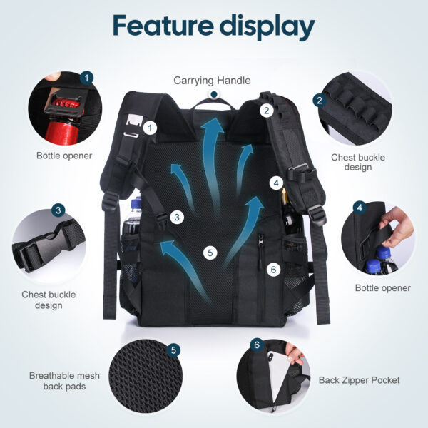 - 【Komfortables und praktisches Design】Die Schultergurte sind mit einem Bierflaschenöffner und einem Schnallengitter ausgestattet, und die verstellbare Brustschnalle hilft Ihnen, den Druck auf Ihre Schultern und Ihren Rücken zu reduzieren, und der Nachtsicherheits-Reflexstreifen kann Ihnen helfen, nachts oder im Dunkeln zu finden.