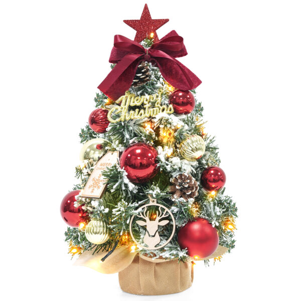 - 【Kleiner Weihnachtsbaum mit Schnee kommt mit Weihnachtsschmuck】Enthält viele Farben und Stile von Weihnachtskugeln, Baumwipfelsternen, Schleifen, Frohe-Weihnachten-Schriftzügen, Tannenzapfen und mehr.