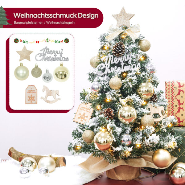 - 【Kleiner Weihnachtsbaum mit Schnee kommt mit Weihnachtsschmuck】Enthält viele Farben und Stile von Weihnachtskugeln, Baumwipfelsternen, Schleifen, Frohe-Weihnachten-Schriftzügen, Tannenzapfen und mehr.