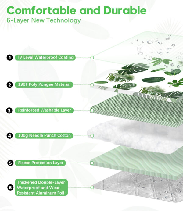 - Neue 4-Schichten-Verarbeitung: Die Oberseite der Picknickdecke ist mit einer IV-Stufe Wasserabwehrbeschichtung versehen, kombiniert mit einem Doppelstichverfahren und 190T Poly-Pongee Material. Zusätzlich enthält es eine verstärkte waschbare Schicht, hochwertige Nadelkissenwatte, eine Füllstoffschutzschicht und eine zweischichtige PE-Folie, die Haltbarkeit und Komfort des Matratschens gewährleisten und für alle Jahreszeiten geeignet ist
