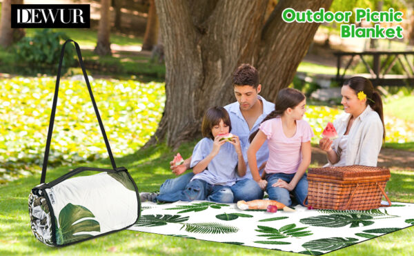 DEWUR Picknickdecke wasserdicht waschbar, Stranddecke Sandfrei XXL Campingdecke Strandmatte isoliert mit Alu wasserdichter Unterseite Grün-Blätter (300 x 200 cm)