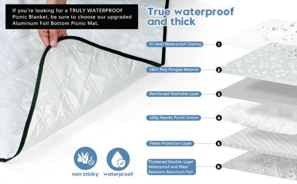 - Neue 4-Schichten-Verarbeitung: Die Oberseite der Picknickdecke ist mit einer IV-Stufe Wasserabwehrbeschichtung versehen, kombiniert mit einem Doppelstichverfahren und 190T Poly-Pongee Material. Zusätzlich enthält es eine verstärkte waschbare Schicht, hochwertige Nadelkissenwatte, eine Füllstoffschutzschicht und eine zweischichtige PE-Folie, die Haltbarkeit und Komfort des Matratschens gewährleisten und für alle Jahreszeiten geeignet ist