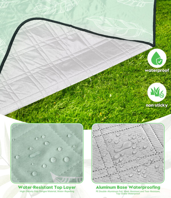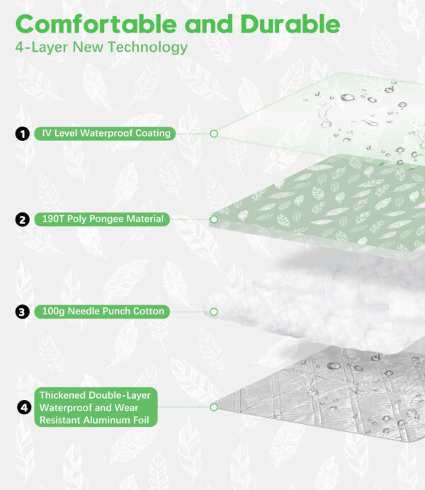 - Neue 4-Schichten-Verarbeitung: Die Oberseite der Picknickdecke ist mit einer IV-Stufe Wasserabwehrbeschichtung versehen, kombiniert mit einem Doppelstichverfahren und 190T Poly-Pongee Material. Zusätzlich enthält es eine verstärkte waschbare Schicht, hochwertige Nadelkissenwatte, eine Füllstoffschutzschicht und eine zweischichtige PE-Folie, die Haltbarkeit und Komfort des Matratschens gewährleisten und für alle Jahreszeiten geeignet ist