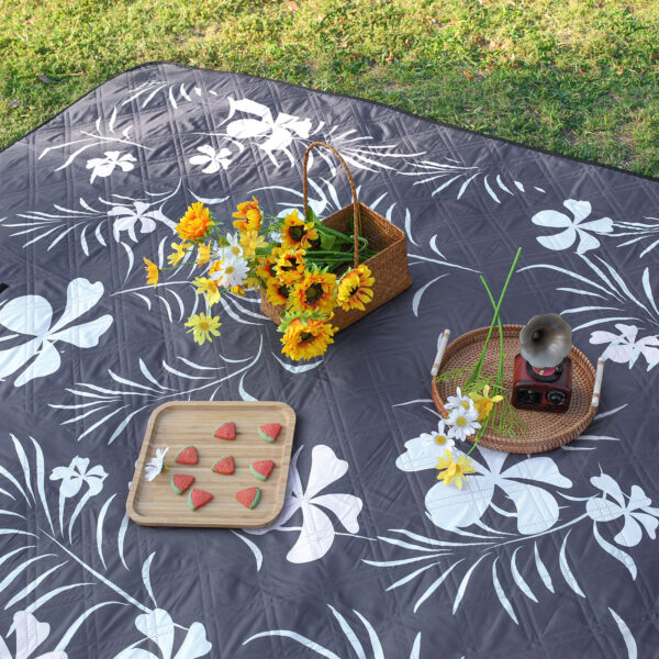 DEWUR Picknickdecke wasserdicht waschbar, Stranddecke Sandfrei XXL Campingdecke Strandmatte isoliert mit wasserdichter Unterseite (Schwarz mit Blumen, 200 x 200 cm)
