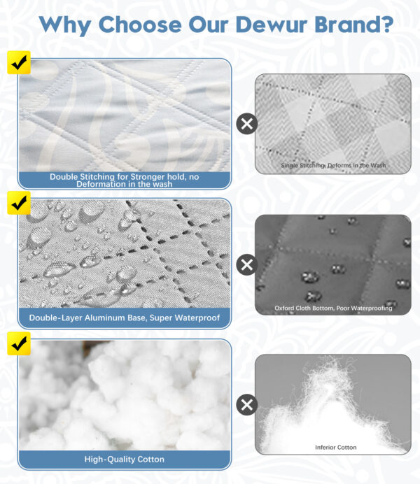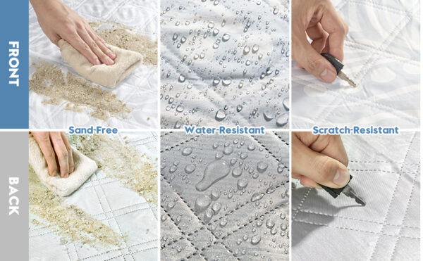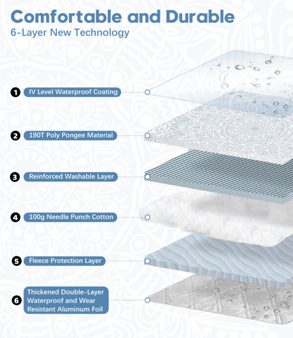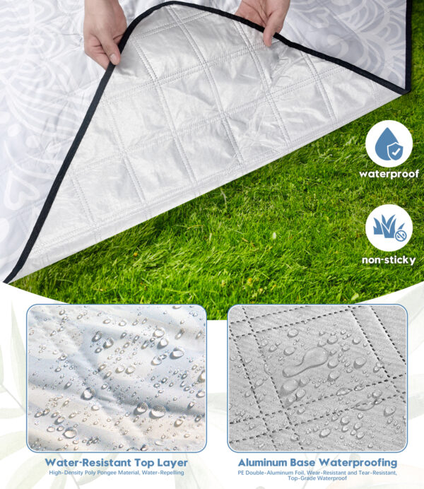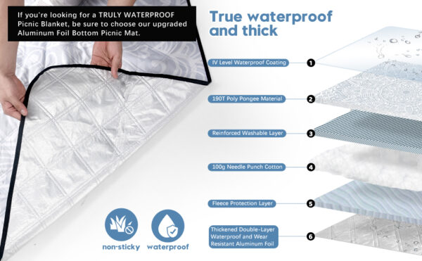 - Neue 4-Schichten-Verarbeitung: Die Oberseite der Picknickdecke ist mit einer IV-Stufe Wasserabwehrbeschichtung versehen, kombiniert mit einem Doppelstichverfahren und 190T Poly-Pongee Material. Zusätzlich enthält es eine verstärkte waschbare Schicht, hochwertige Nadelkissenwatte, eine Füllstoffschutzschicht und eine zweischichtige PE-Folie, die Haltbarkeit und Komfort des Matratschens gewährleisten und für alle Jahreszeiten geeignet ist