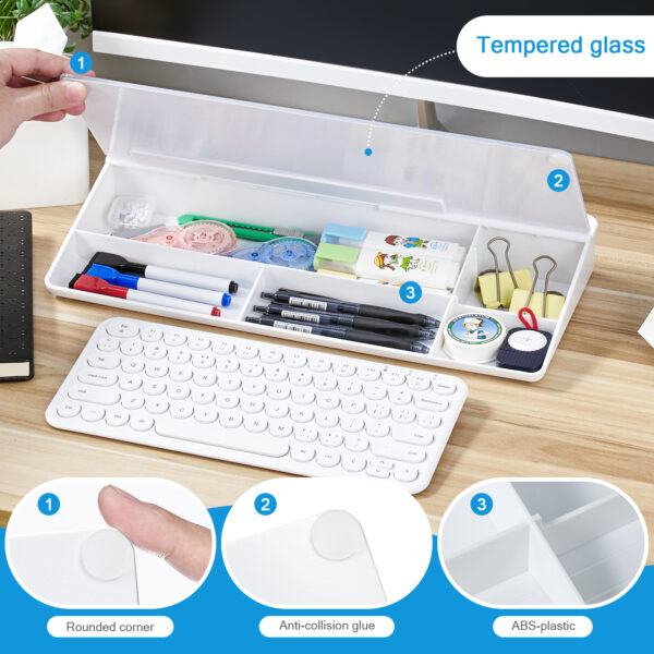 【Deskboard mit verstecktem großen Stauraum】Nach dem Öffnen der Glasscheibe sehen Sie, dass der untere Teil aus hochwertigem Kunststoff besteht. Es gibt mehrere Ablagefächer unterschiedlicher Größe, die Stifte, Radierer, Reißzwecke, Büroklammern, Notizen, Clips und Lineale, Kleines Heftgerät und anderes Büromaterial verstauen können. Es ist ein unverzichtbares Accessoire für Ihre Schreibtischorganisation.