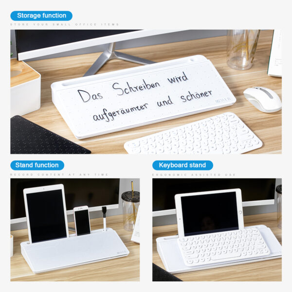 【Multifunktionales Schreibtisch Whiteboard】das ist nicht nur ein Whiteboard, ein Notepad, sondern auch ein Tablet Ständer, ein Handy Halterung, ein iPad Ständer, ein Tastatur Halterung und ein Schreibtischorganizer. Geeignet für Besprechungsprotokolle, Notizen und geeignet Für Bedürfnisse wie Büro und Homeoffice