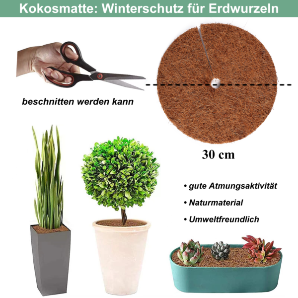 - 【Mit einem Kokosmatte mit 37 cm Durchmesser】Damit Pflanzen den Winter sicher überstehen, ist neben der Pflanzenabdeckung auch die Temperatur der Erdwurzeln sehr wichtig.Gekoppelt mit dieser mäßig dicken Kokosmatte kann es Ihre Pflanzen im Winter sicher besser schützen